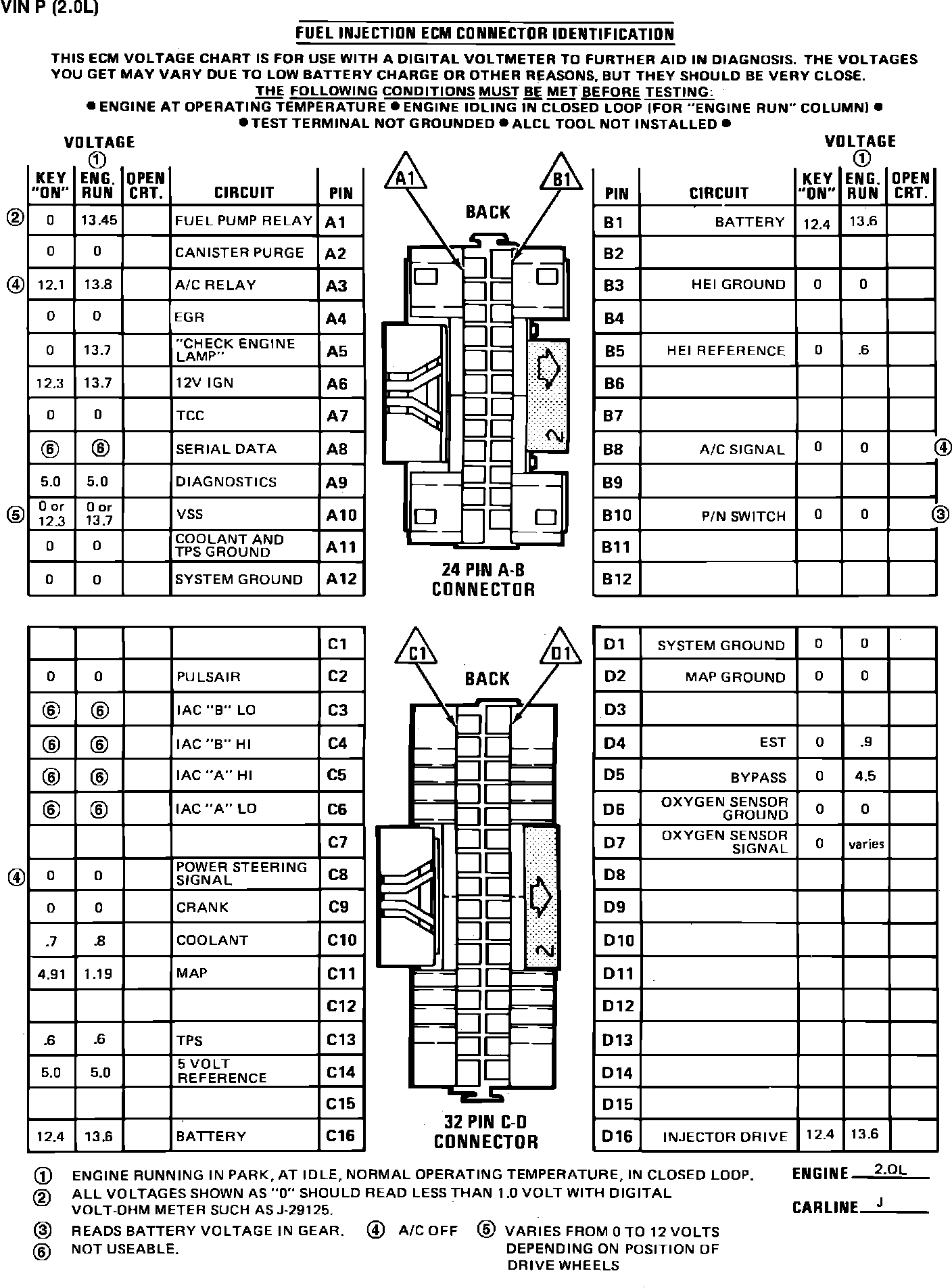Fig. 001 ECM Connector Terminal I.D. & Volt. Specifications:
