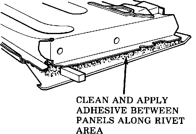 8. Mix equal parts of 3M structural adhesive #8101 or equivalent thoroughly and rapidly apply bead of adhesive between the separated panels along rivet area of frame, refer to Figure 3. The structural adhesive will cure at varying speeds depending on temperature. The higher the temperature, the shorter the curing time.