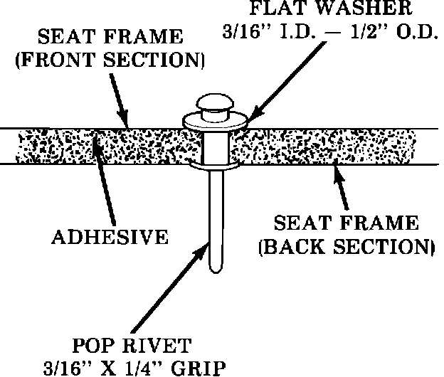 10. Working from the back side of the seat panel, replace all removed rivets with 3/16" diameter, 1/4" long rivets as follows. Place a 3/16" inside diameter 1/2" outside diameter flat washer over the rivet from the front side of the seat back panel and install rivet to secure seat panel sections together, refer to Figure 4. Do this at each location where rivets were removed.