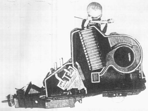 11. With the temperature door in the max. hot position, reach through the temperature housing and push the lower forward corner of the heater core away from the housing. Then rotate the core parallel to the housing. This causes the core to snap out of the lower clamp. The core may not be removed in a vertical direction due to the configuration of the lower core tank, lower clamp and temperature housing.