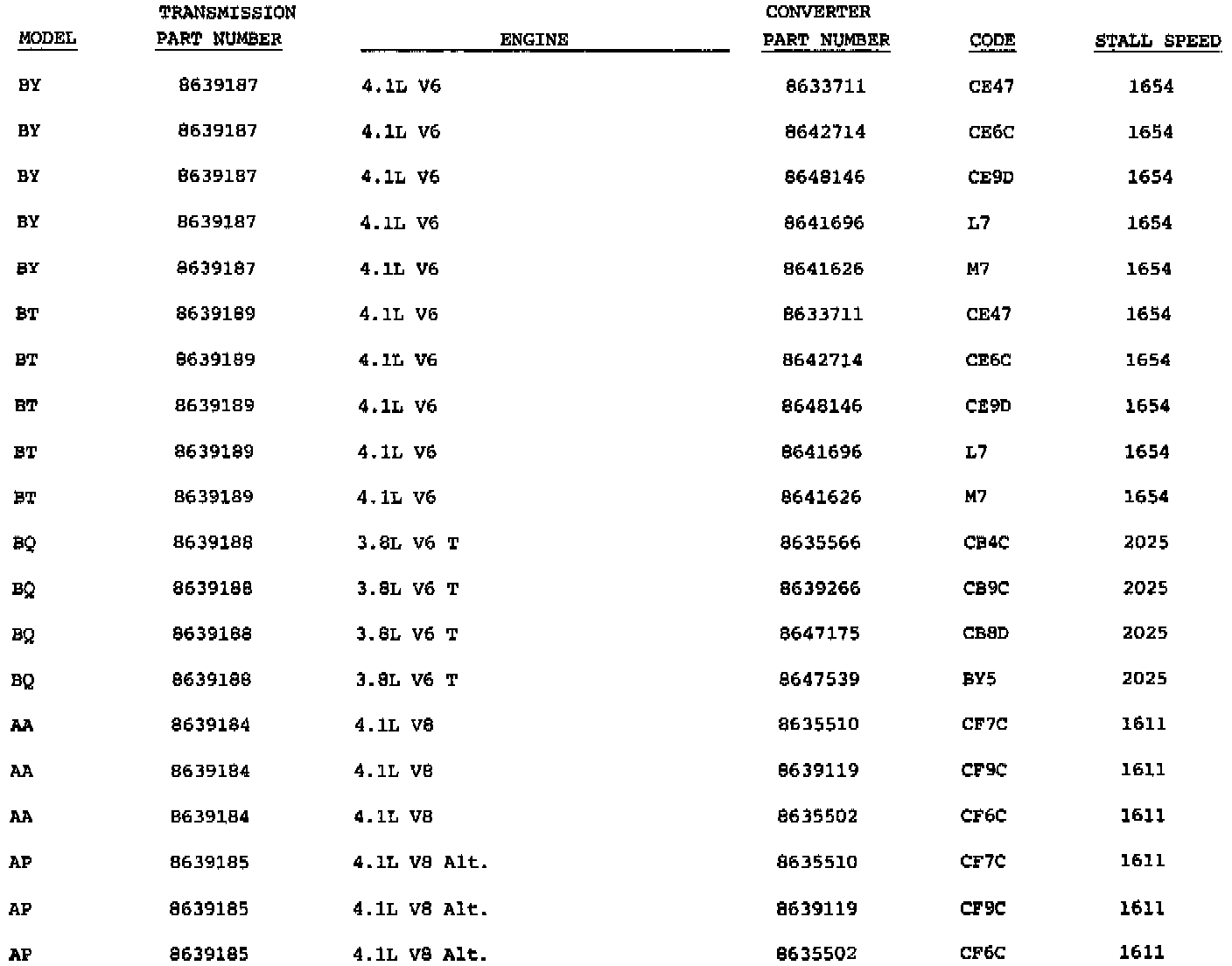The information is provided for 1984 model transmissions. It will enable you to identify some models and converter usage.