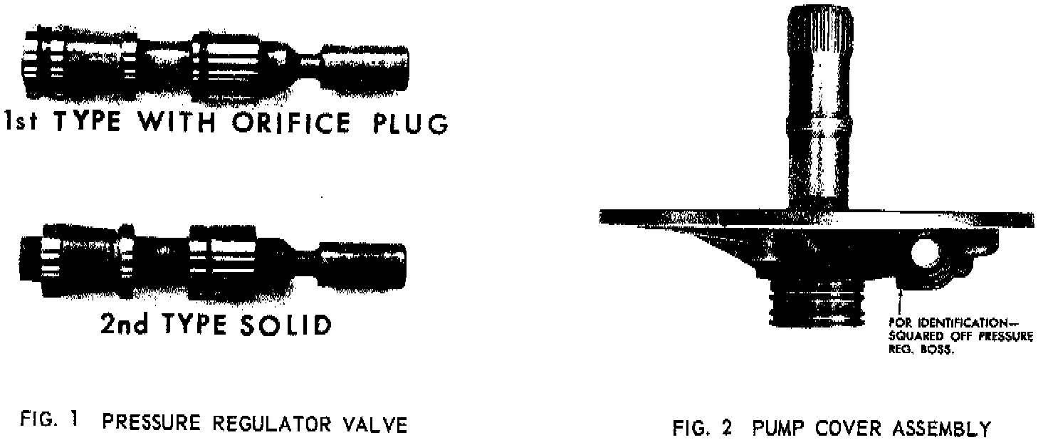THE SOLID VALVE, 2ND TYPE, MUST ONLY BE USED IN THE PUMP COVER ASSEMBLY WITH THE SQUARED OFF PRESSURE REGULATOR BOSS (PRESSURE BOOST BUSHING END) FIG. 2. THE PRESSURE REGULATOR VALVE, 1ST TYPE, WITH OIL HOLES AND ORIFICE CUP PLUG, IS RELEASED FOR SERVICE AND CAN BE USED TO SERVICE EITHER PAST MODEL OR THE CURRENT PUMP COVER ASSEMBLY.