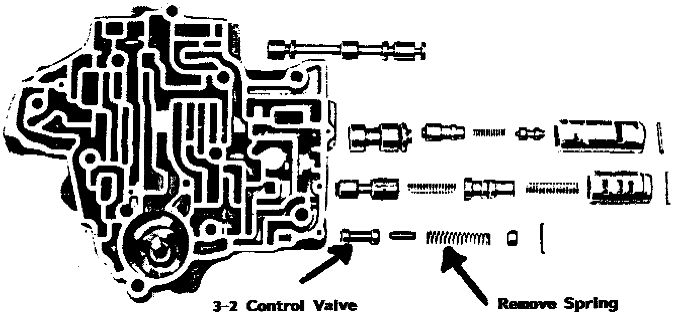 Before removing the 3-2 control valve spring, be sure the problem is not engine vacuum related, or electrical. By removing the 3-2 control valve spring, all part throttle downshifts will be eliminated; passing gear will only occur with detent, or full throttle downshifts.