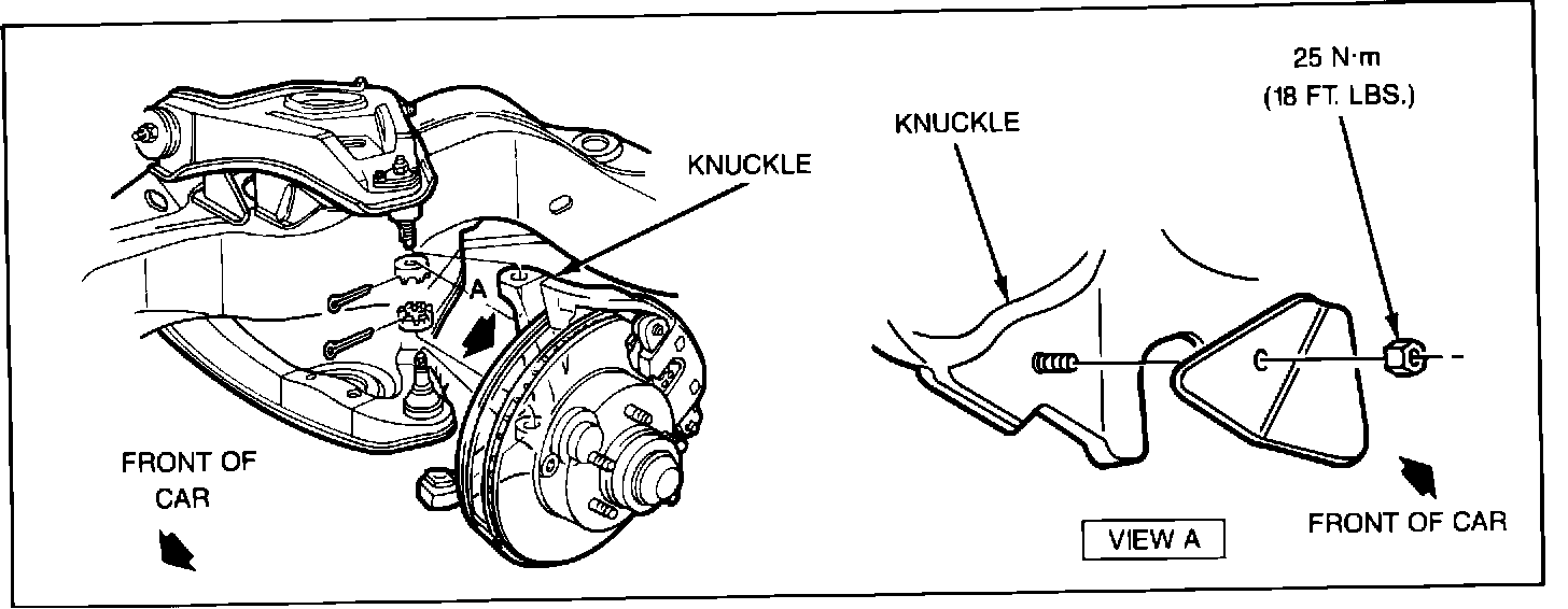 6. Install steering stop to knuckle over new bolt and secure with nut, P/N 9422295, and torque to 25 N-m (18 ft.lbs.). The pointed end of the steering stop should point toward the rear of the car. Refer to Figure 1.