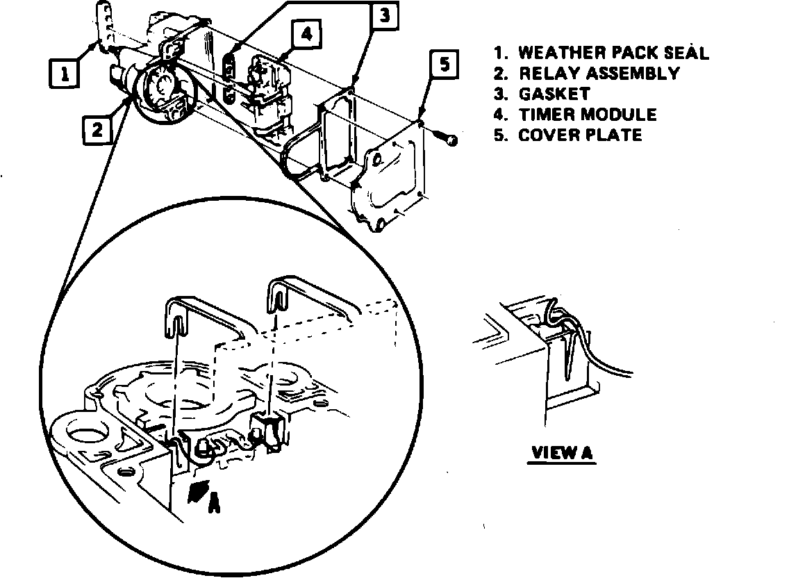 3. Pull the relay wires out of both clips. Scrape the ends of the wires to remove the coating. Supply a ground to one end of relay wire and momentarily place 12 volts to the other end to be sure the relay works. (The sound and motion of the relay working is very evident). If the relay works, position the scraped end of the wires down into the clip area as shown in View A of Figure 1 and reinstall the timer module.
