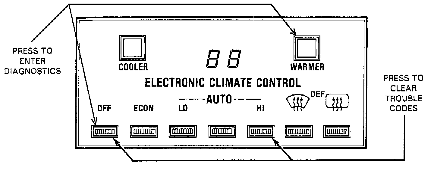 Trouble codes stored in the Electronic Control Module (ECM)'s memory may be cleared (erased) by entering the diagnostic mode and then depressing the "OFF" and "HI" buttons simultaneously. Hold until "00" appears. After "00" is displayed, the ECM will display "70".
