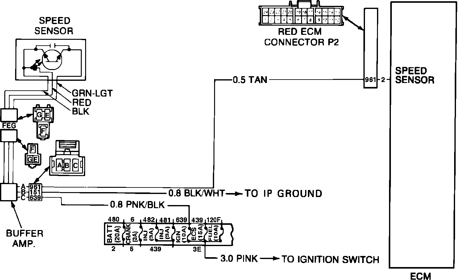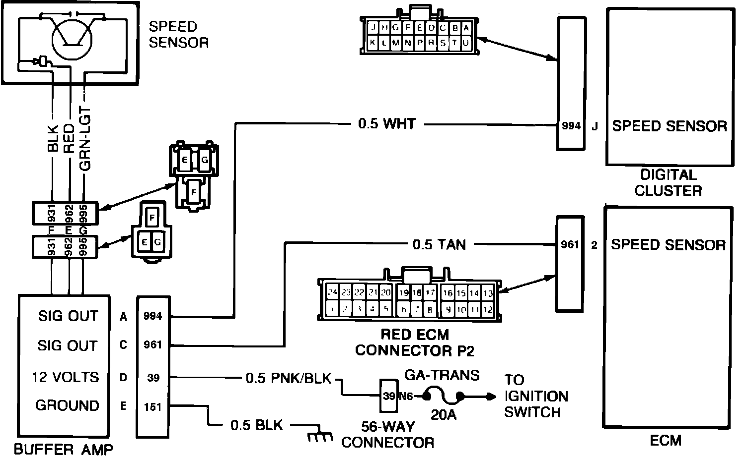 The speed sensor generates an electrical signal representative of vehicle speed and the buffer amplifier amplifies and inverts this signal for use by the ECM. Code 24 indicates that the speed signal is not being received by the ECM when the vehicle is in fourth gear. Possible causes of this condition are: