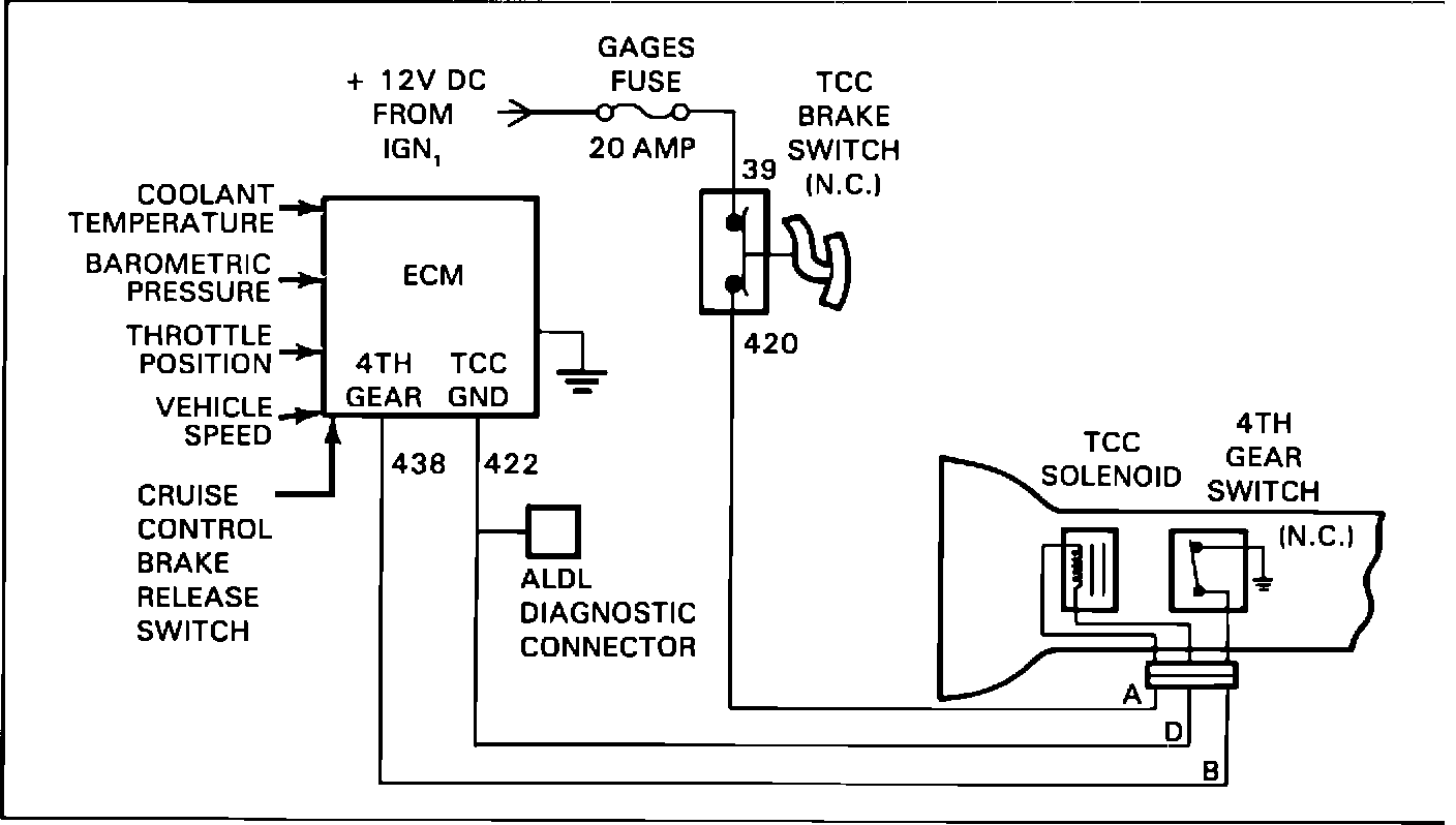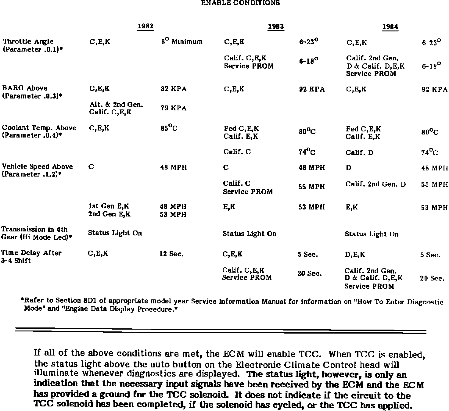 Enable conditions are those vehicle operating conditions that must be present before the ECM will provide the ground for the TCC solenoid. The ECM controls the apply of TCC by grounding circuit # 422 (see Figure 1) which energizes the TCC solenoid, shifts the apply valve, and thereby supplies oil pressure to the Torque Converter Clutch.