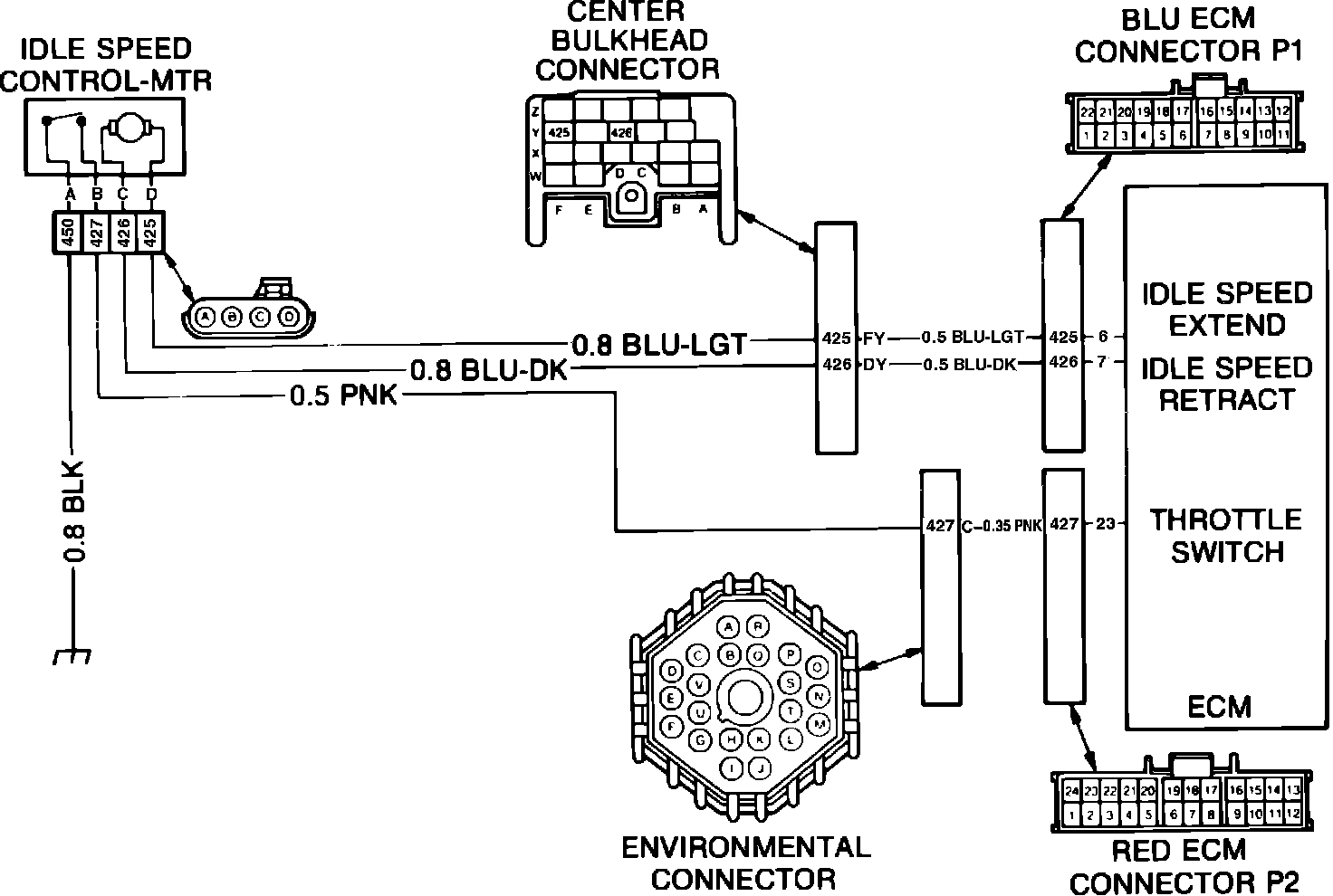 The ECM supplies a 12 volt signal to the idle speed control motor (ISC) pin B. When the engine operates at idle speed, the throttle linkage contacts the ISC plunger and closes the throttle (Idle) switch. This changes the voltage at ISC motor pin B harness terminal from 12 to zero volts. Code .7.2 indicates that the throttle switch is malfunctioning.