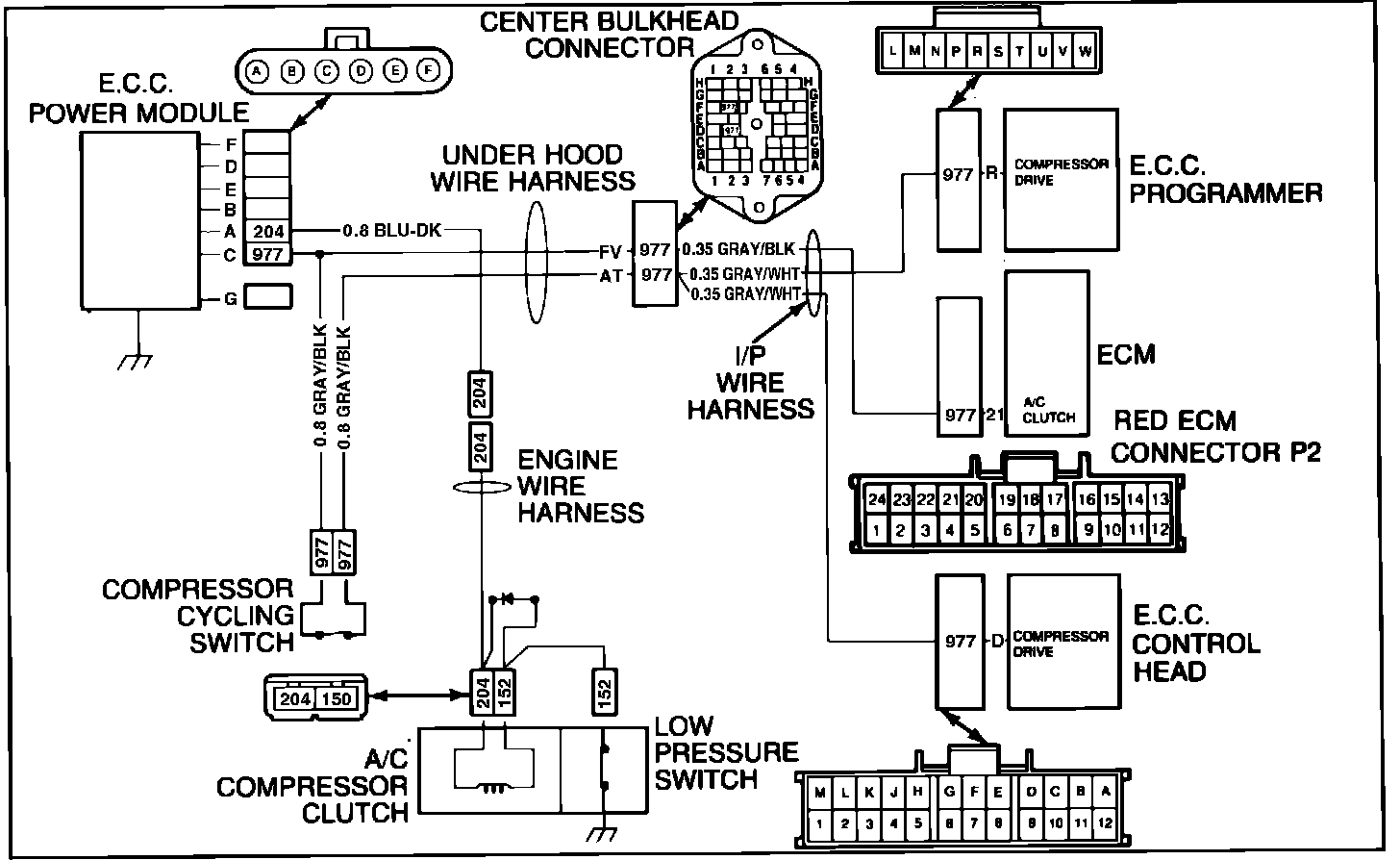 When the air conditioner clutch is operating, the ECC programmer sends a 12 volt signal to the ECM so that the ECM can compensate for the added air conditioner load placed on the engine. Trouble code .8.0 indicates that the ECM is not receiving the 12 volt signal from the programmer when the air conditioner clutch is activated.