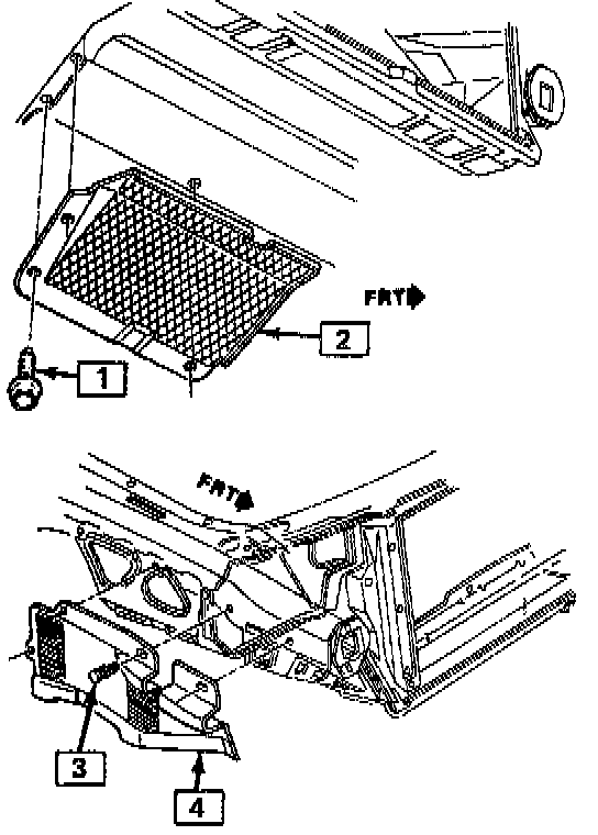 3. Four right engine splash shield retainers (3) and splash shield (4).