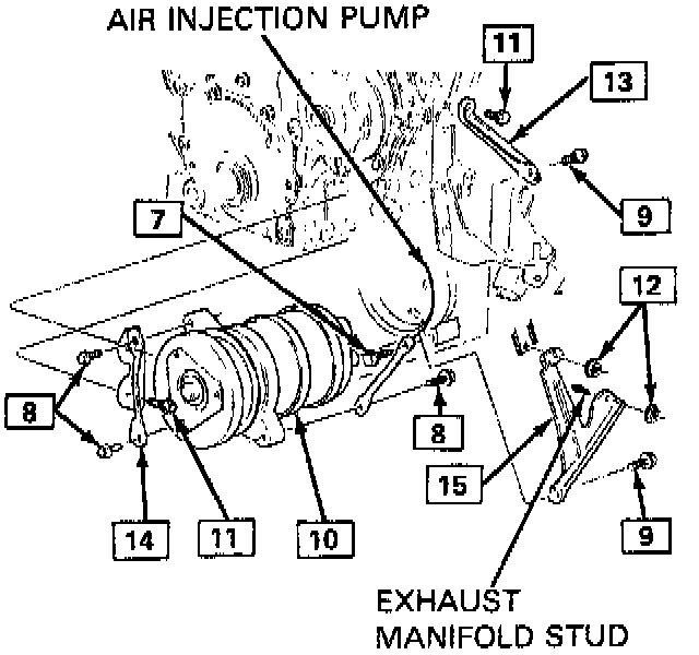 6. Loosen AIR pump to compressor brace bolt (7) one turn.