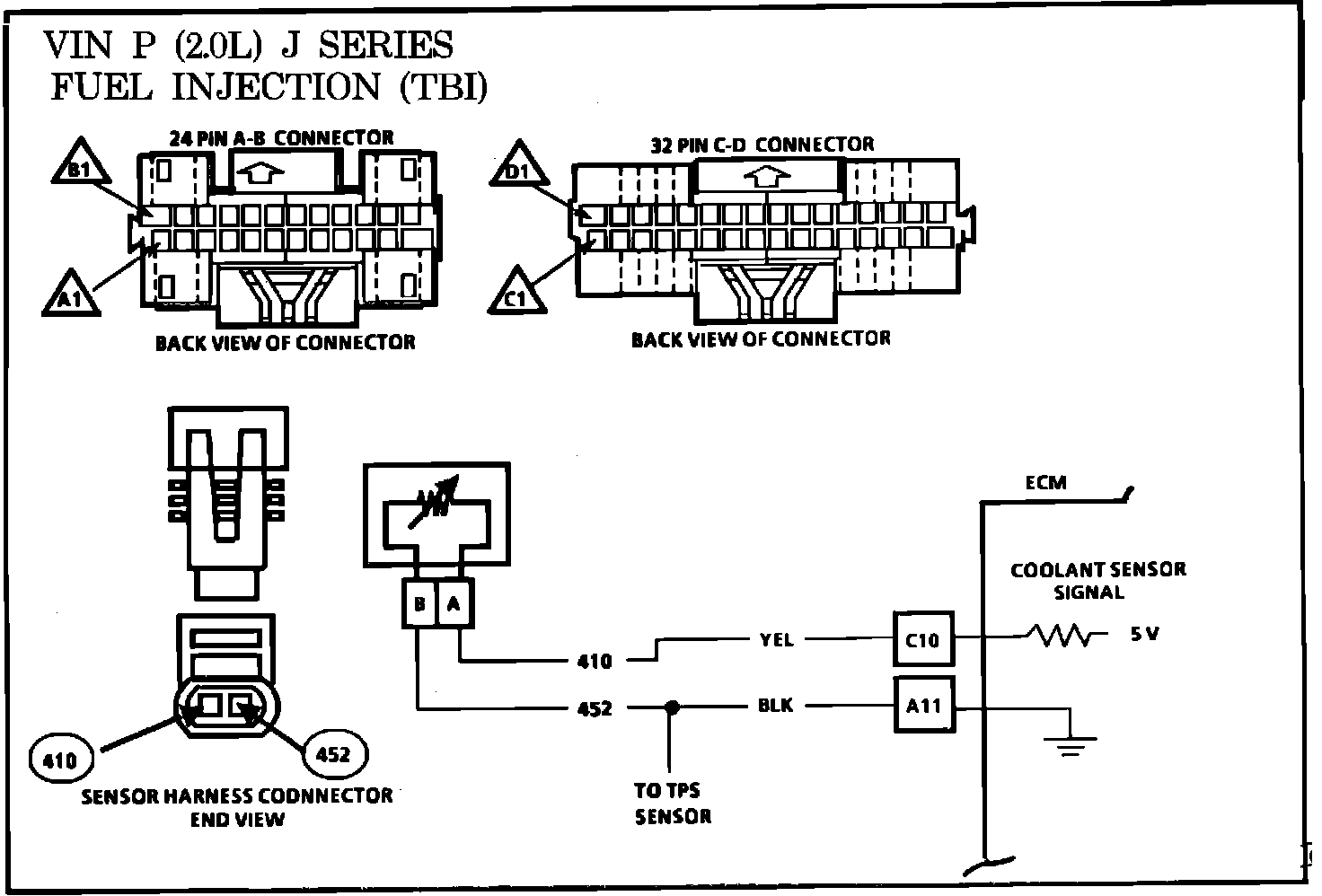 As the engine warms, the sensor resistance becomes less, and the voltage drops. At normal engine operating temperature the voltage will measure about 1 to 1.5 volts at the ECM terminal C10.