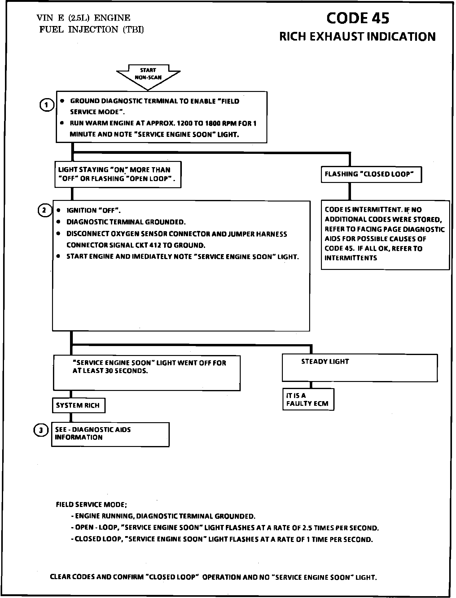 2. A steady light or "Open Loop" indicates the fault is present. Grounding CKT 412 causes a low O2 signal voltage. If the ECM and wiring are OK, The ECM should recognize the low voltage and confirm the lean signal by turning off the "SERVICE ENGINE SOON" light for at least 30 seconds.