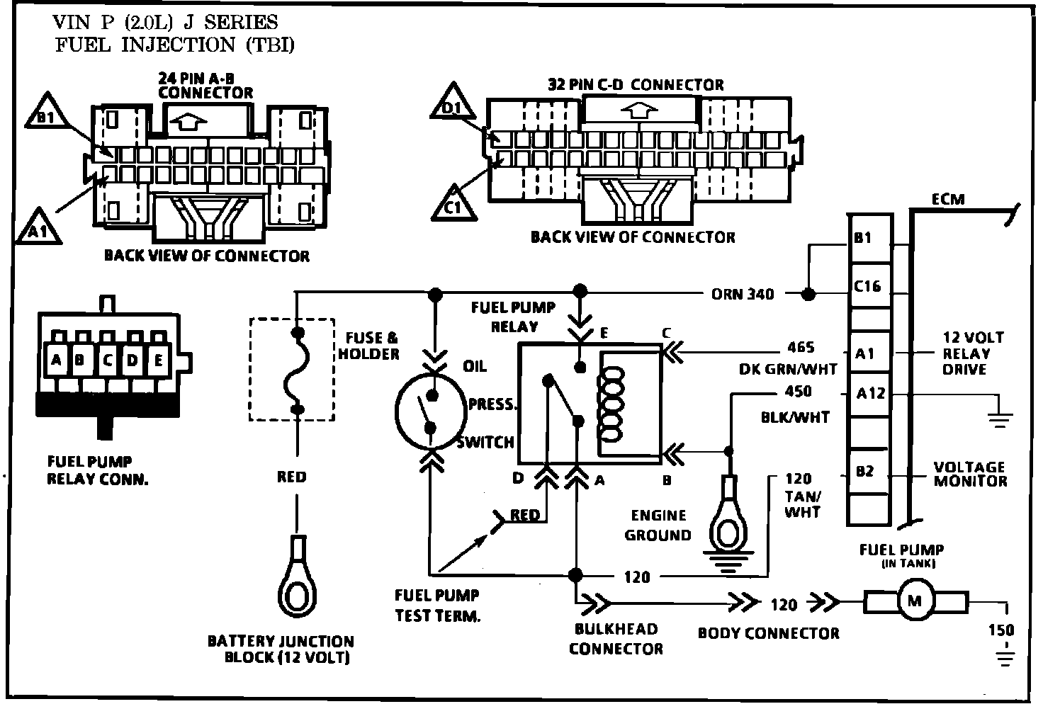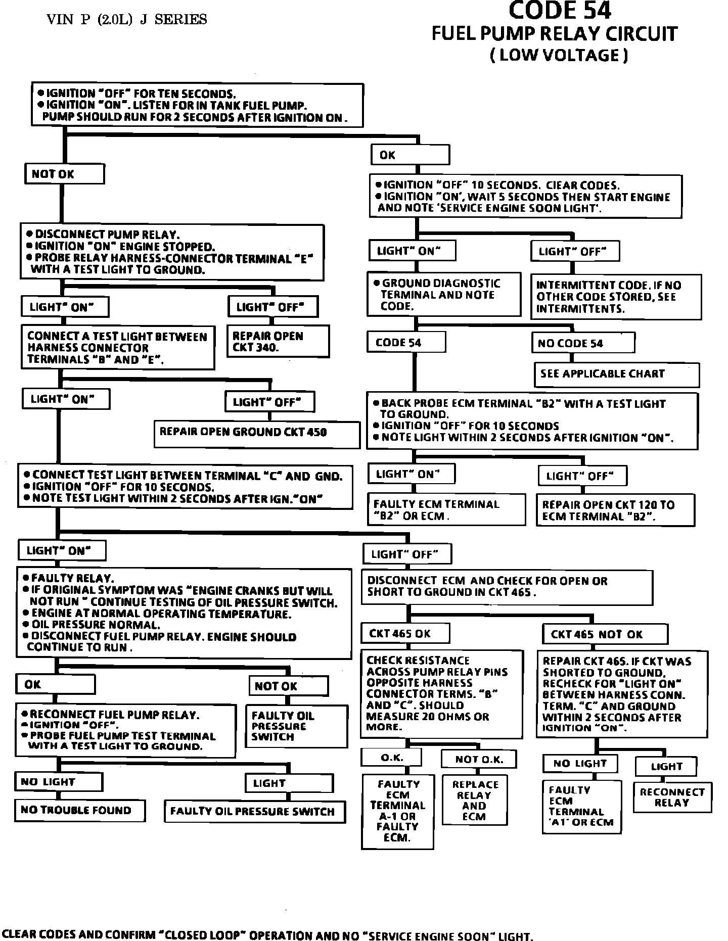 When the ignition switch is turned on, the ECM terminal B2 looks for voltage on pump circuit 120 for .2 seconds. If voltage is not present, it will set Code 54 and turn on the SERVICE ENGINE SOON" light after engine starts.
