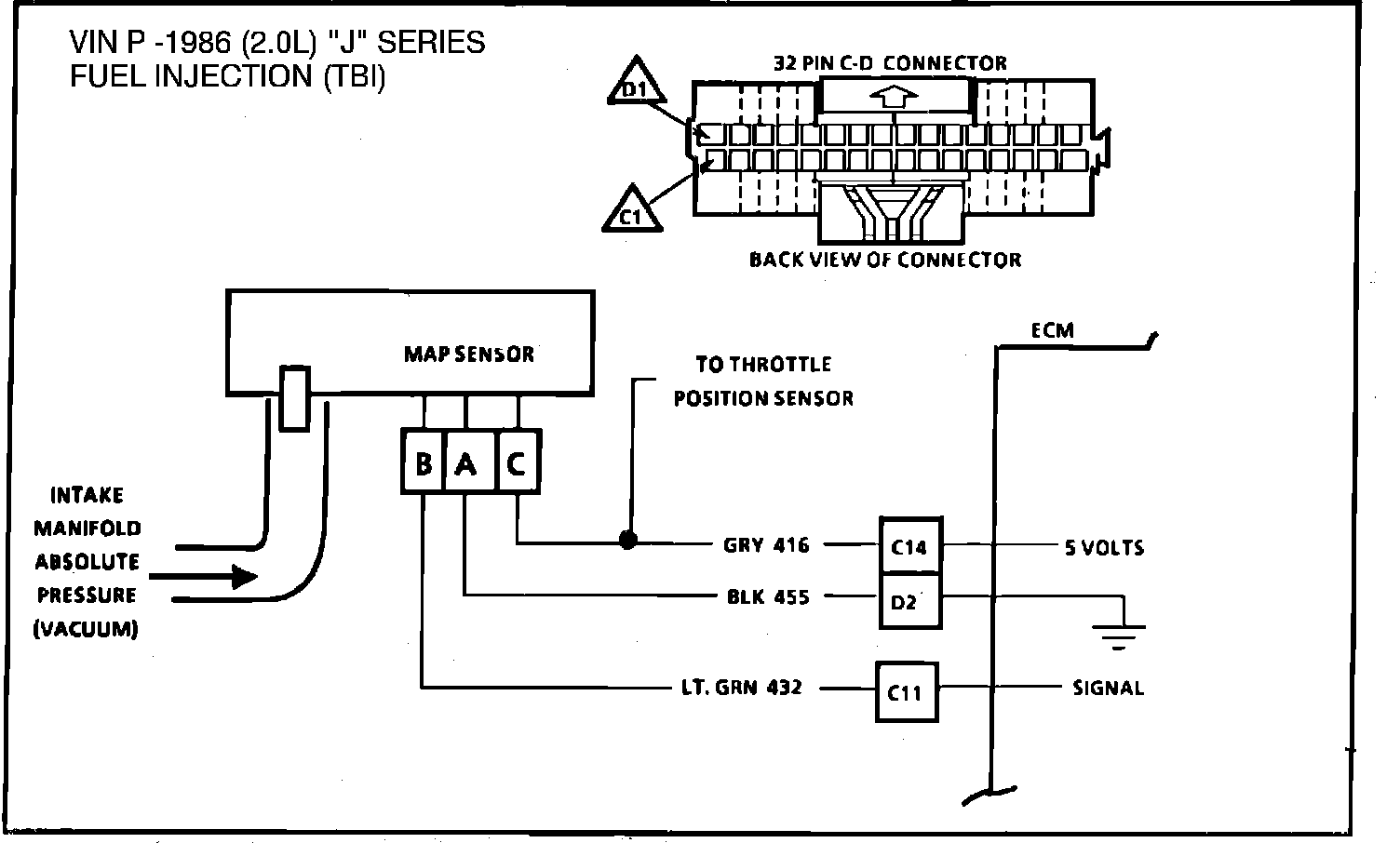 1. Checks MAP sensor output voltage to the ECM. This voltage, without engine running, represents a barometer reading to the ECM.