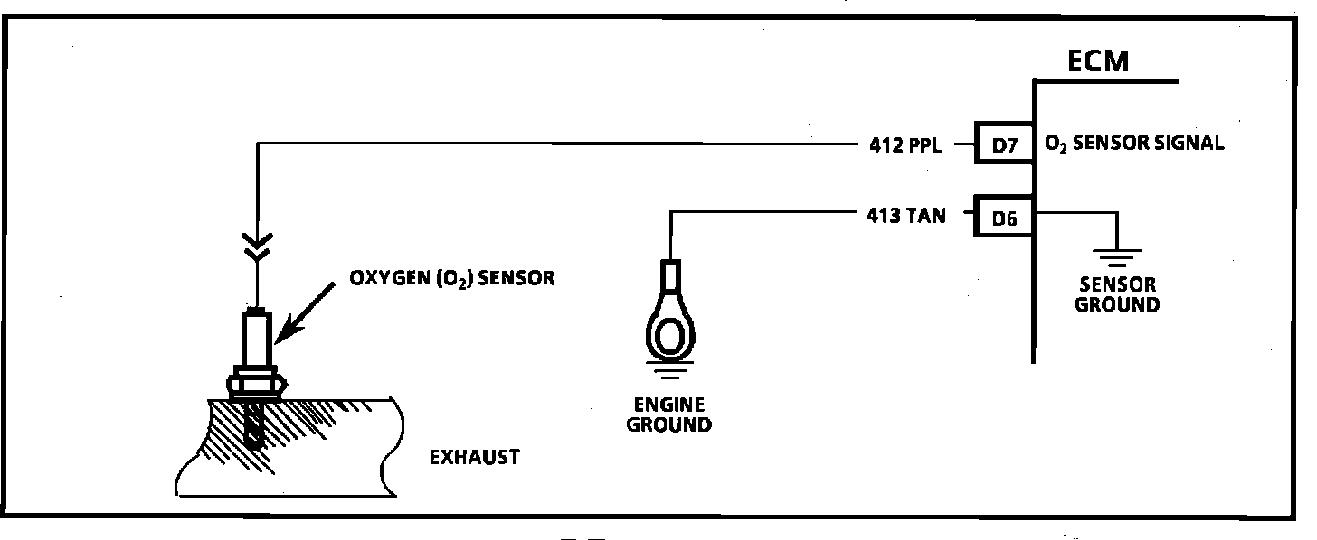 The Electronic Control Module (ECM) supplies a voltage of about .45 volt between terminals "D7" and "D6". (If measured with a 10 megohm digital voltmeter, this may read as low as .32 volt.) The 02 sensor varies the voltage within a range of about 1 volt if the exhaust is rich, down through about .10 volt if exhaust is lean.
