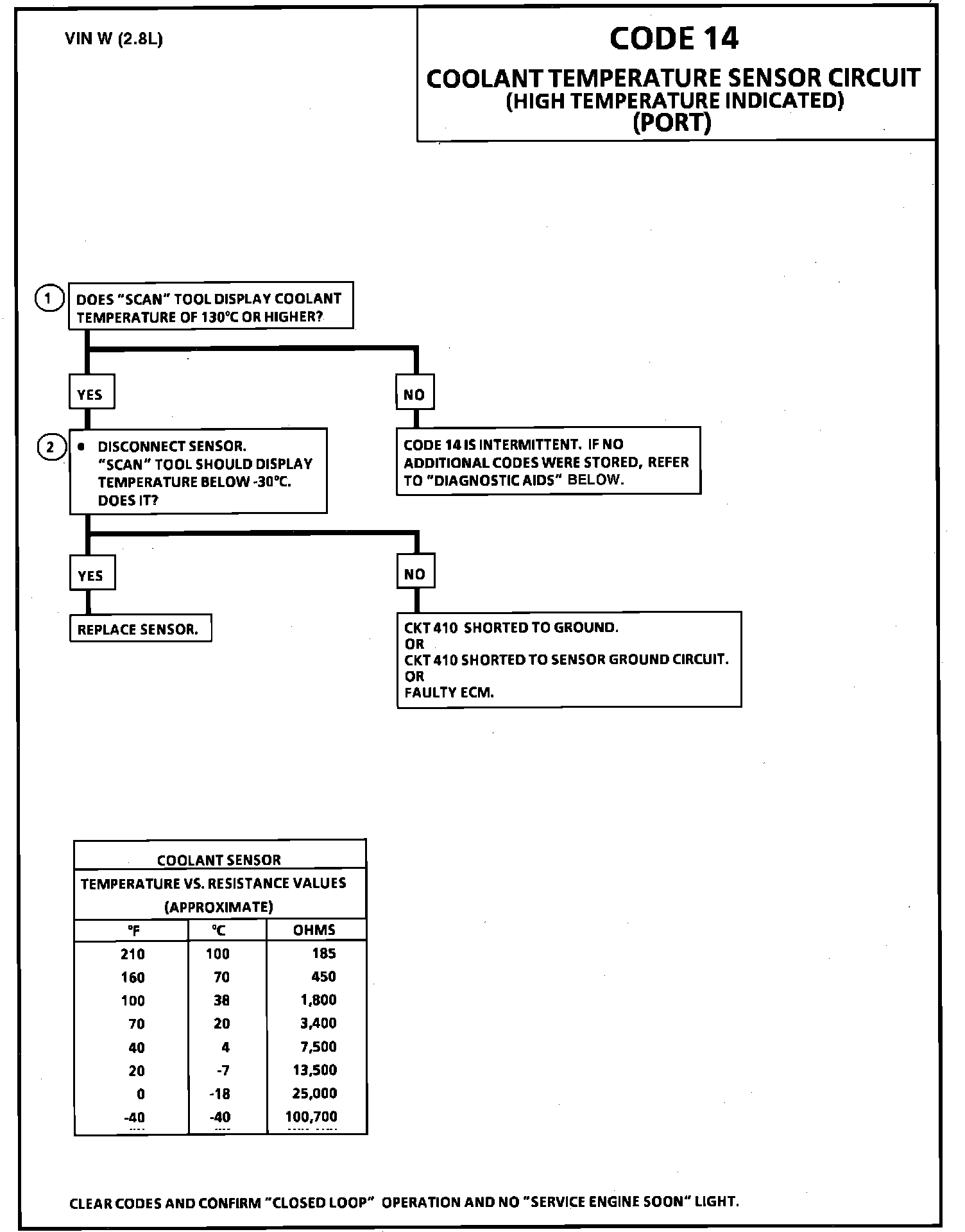 CODE 14 - COOLANT TEMPERATURE SENSOR CIRCUIT (HIGH TEMPERATURE INDICATED)