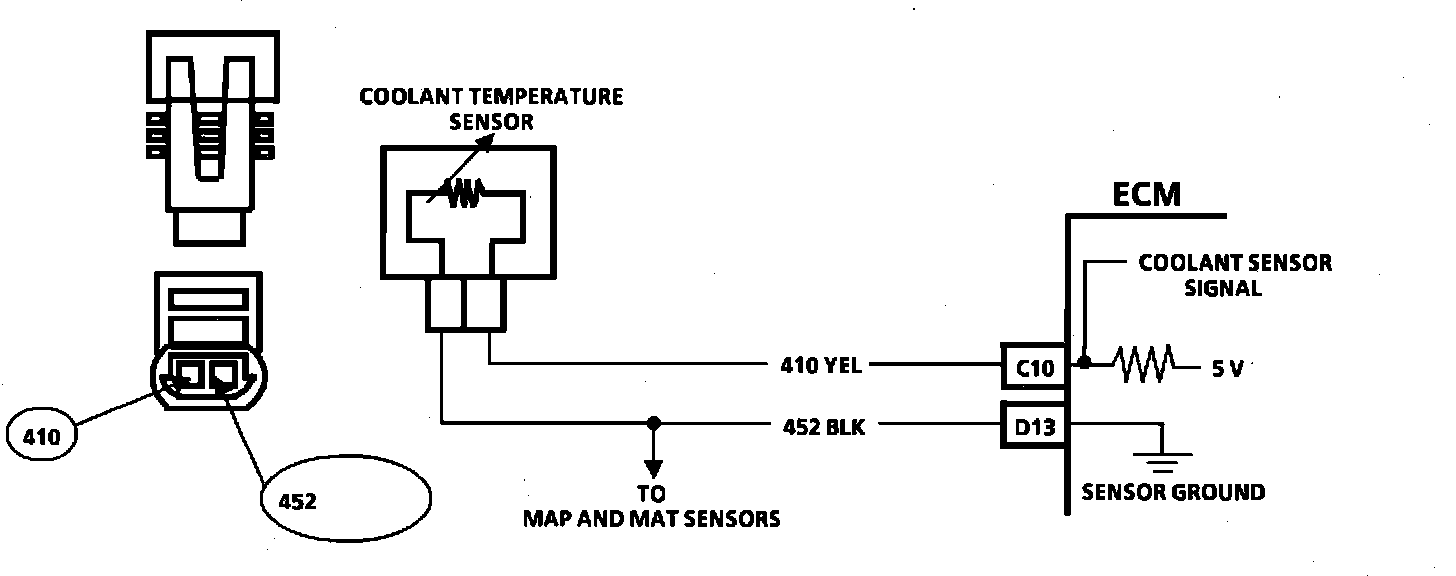 The coolant temperature sensor uses a thermistor to control the signal voltage to the Electronic Control Module (ECM). The ECM applies a voltage on CKT 410 to the sensor. When the engine is cold the sensor (thermistor) resistance is high, therefore the ECM will see high signal voltage.