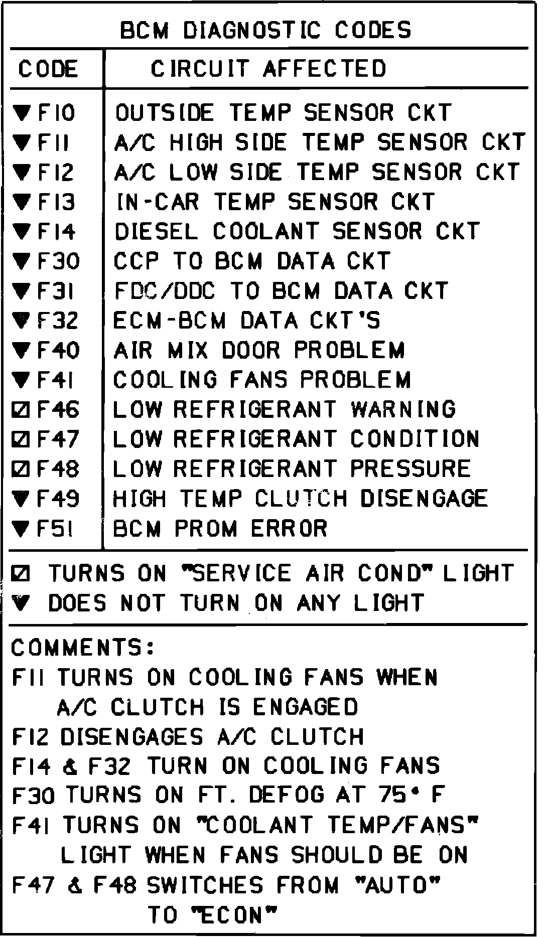 The ECM and BCM continually monitor operating conditions of their controlled systems for possible malfunctions. When a problem is detected, a two-digit numerical ``trouble code,'' Figs. 2 and 3, is stored in computer memory. These codes can be displayed as aid in system repair. Any malfunctions which the vehicle operator should be aware of will illuminate ``Service Now'' or ``Service Soon'' warning lamps on the dashboard.
