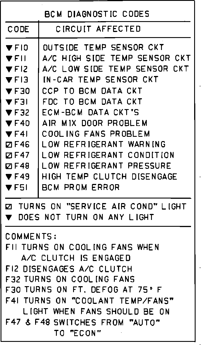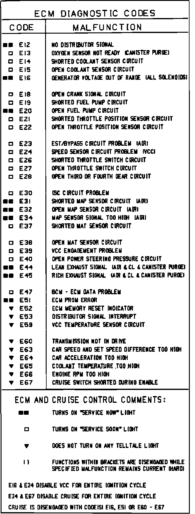 The ECM and BCM continually monitor operating conditions of their controlled systems for possible malfunctions. When a problem is detected, a two-digit numerical "trouble code," Figs. 1 and 2, is stored within the computer memory. These codes can be displayed as aid in system repair. Any malfunctions which the vehicle operator should be aware of will illuminate Service Now or Service Soon warning lamps on the dashboard.