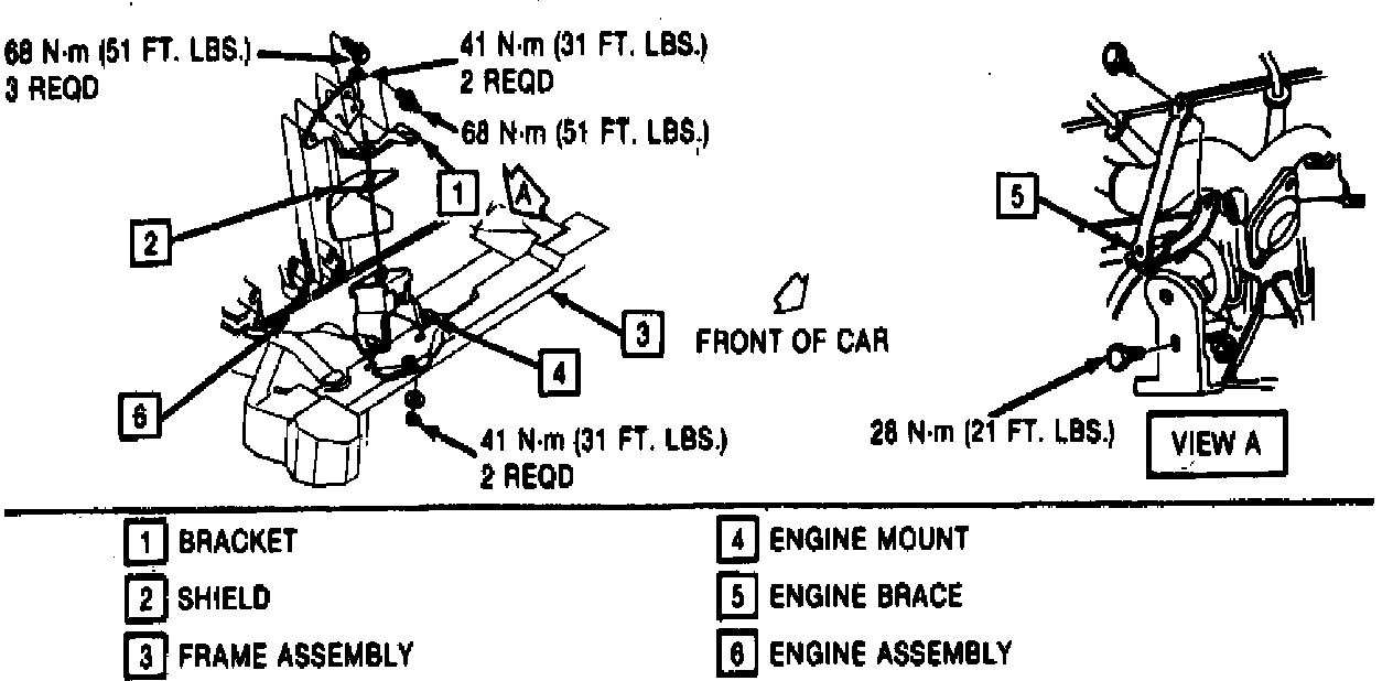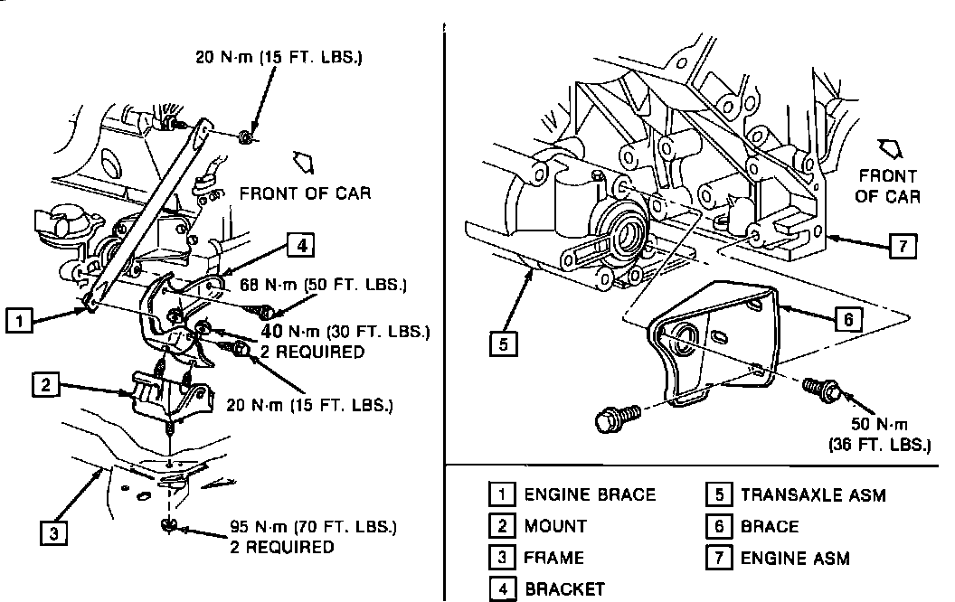 32. Remove front (left) engine mount nuts and right rear engine/transaxle mount bolts, Figs. 1 and 2.