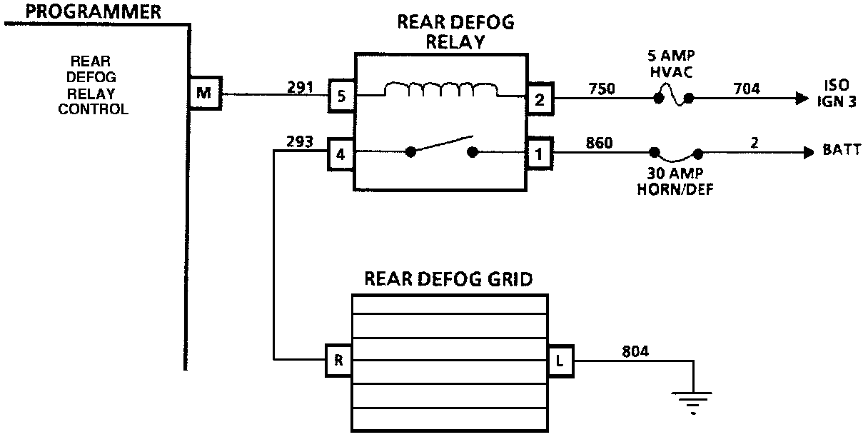 The programmer provides a ground for the defogger relay when it receives a command from the Climate Control Panel (CCP) via the data line. The Body Control Module (BCM) times the operation initially for 10 minutes, then commands the programmer to deactivate the relay ground. Additional requests for rear defogger are for 5 minute intervals thereafter, until a new ignition cycle occurs.