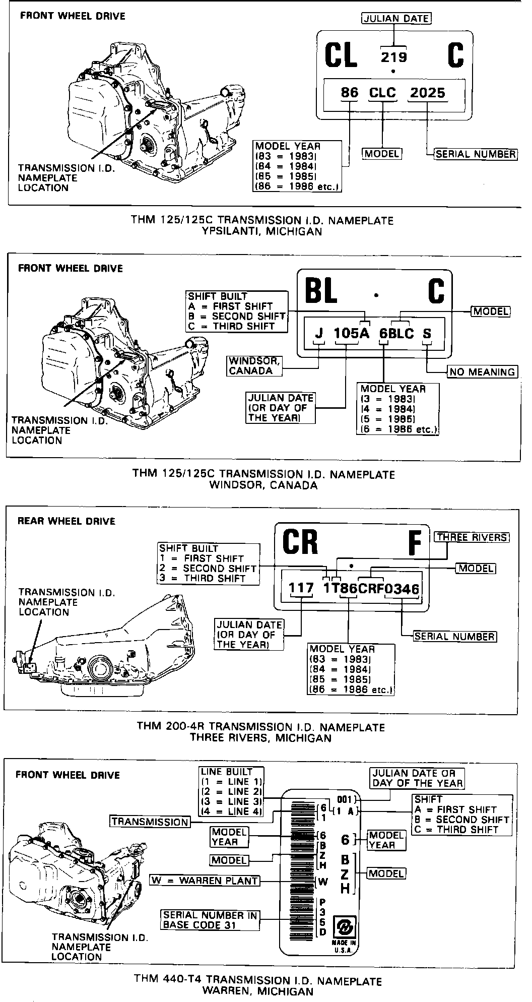 MODEL: Beginning with the start of 1986 production, all THM transmissions have a 3-letter model designator as opposed to the 2-letter model designator used in previous years. The third letter in each code group identifies the type transmission as follows: