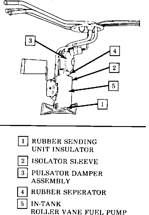 In addition, the removal and installation procedure has changed to accommodate the transfer of parts to the pump being installed. There are four noise suppression devices used with the roller vane pump which must be assembled to the replacement pump. Failure to assemble the noise suppression parts to the replacement pump may result in owner comments about excessive noise. For warranty purposes, use Labor Operation number L1200 at 1.2 hours. The parts to be assembled to the sending unit are as follows (see Figure 1):