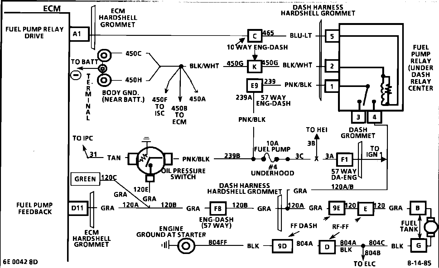 2. If the fuel pump relay or ECM were the cause of a low fuel pressure, there would be an ECM code EO20 set. This step is to check for voltage supply to the fuel tank four-way connector.
