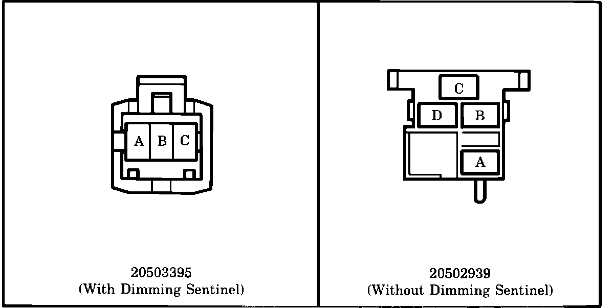 Some 1986 Touring Coupe or Touring Sedans may experience an inoperative dimming sentinel. This condition may be caused by the installation of an incorrect dimmer switch jumper harness. To correct this condition, install the correct harness as listed. Vehicles equipped with dimming sentinel should have harness 20503395 (see figure below). Vehicles not equipped with dimming sentinel should have harness 20502939.