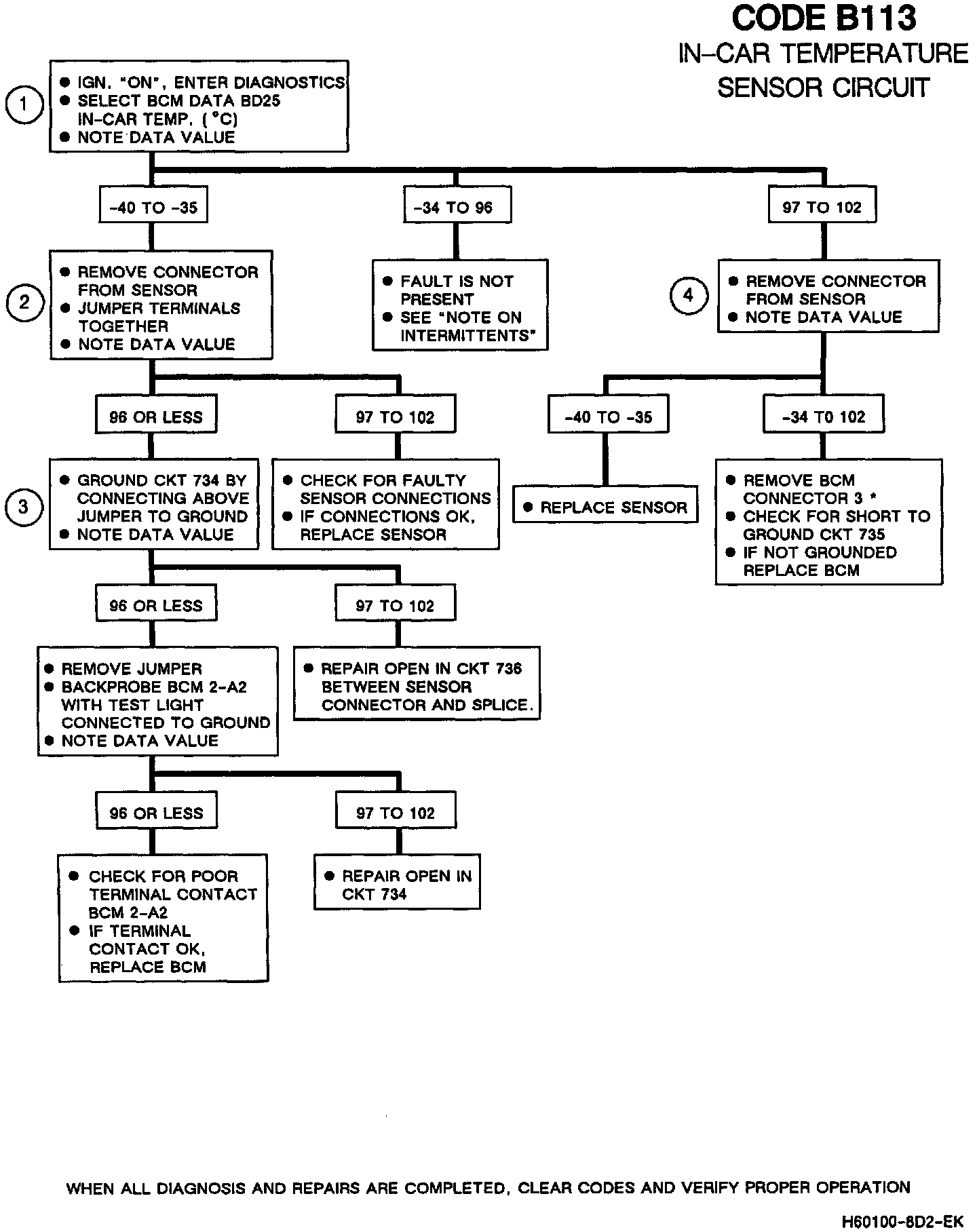 If an intermittent Code B113 is being set, manipulate the related wiring while observing BCM data BD25. If the failure is induced, the reading will jump from its normal value to a reading outside the range of -34C (-29°F) to 96°C (205°F).
