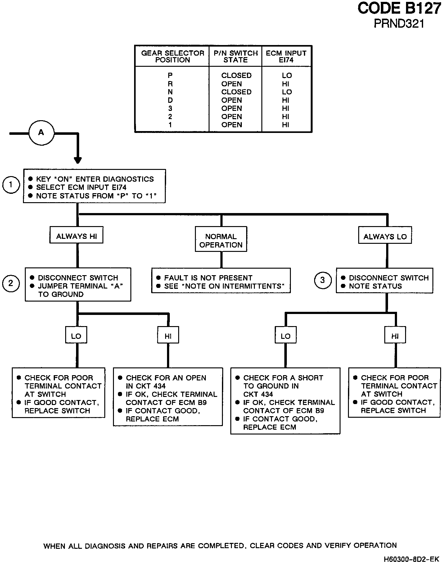 If an intermittent B127 is being set both circuits 356 and 434 should be checked while manipulating the gear selector switch wiring. To check CKT 356, observe the data value BD41 for a zero reading and to check CKT 434, observe input value E174 for a change-of-state indicator to change from "0" to "X".