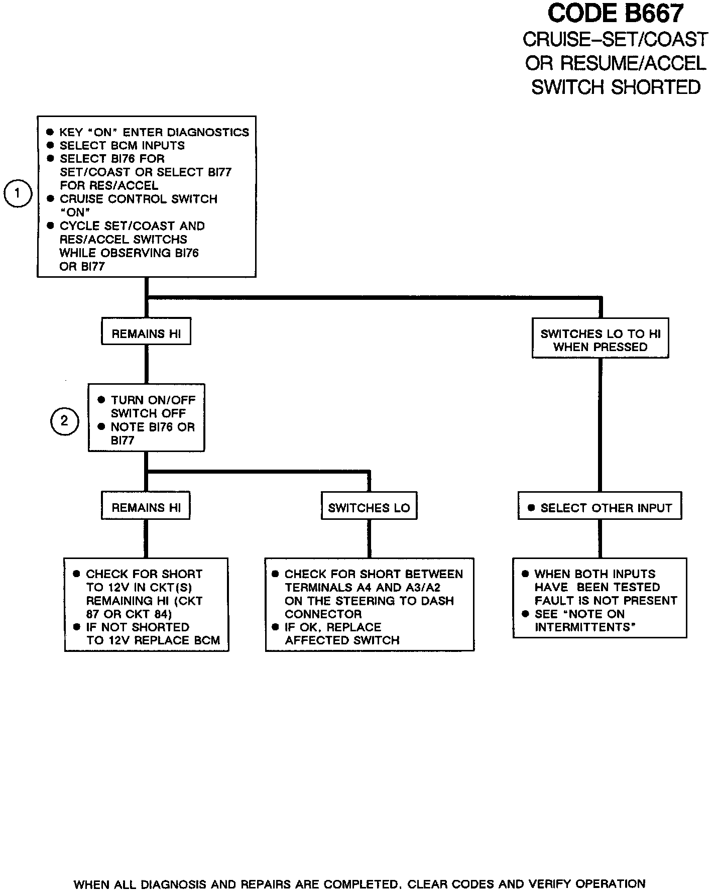 If an intermittent Code B667 is being set, manipulate the related wiring while observing BCM inputs B176 and B177. If the failure is induced the reading will jump from LO to HI with the switch off (not depressed). This code can also be set by the operator if the cruise ON/OFF switch is turned "ON", or the ON/OFF switch was left on when the ignition key is turned on and the operator was depressing either the Set/Coast or Resume/ Accel switches.