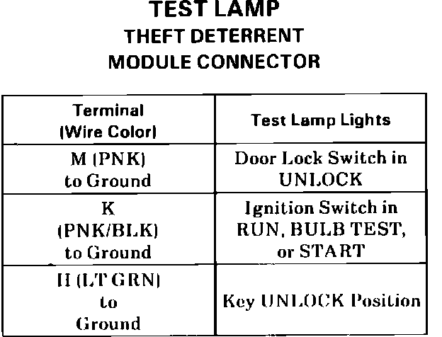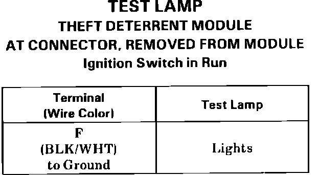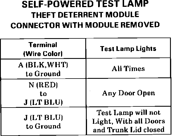 ^ Using a self powered test lamp at the theft deterrent module connector, check for continuity at the indicated terminals in chart.