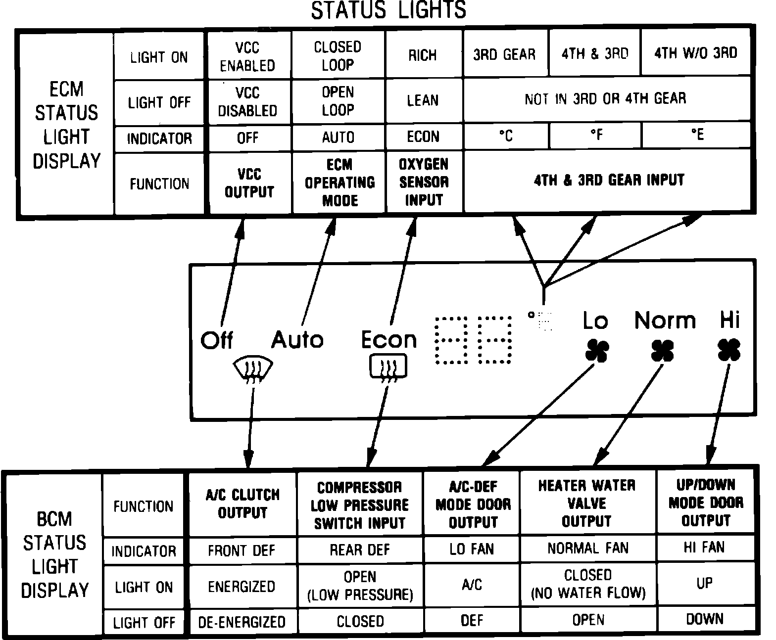 To enter diagnostic mode, turn ignition On, then depress Off and Warmer buttons on the Climate Control Panel (CCP), Fig. 2. Hold buttons until all display panel segments illuminate (segment check), indicating beginning of diagnostic readout. The two display panels must be illuminated to ensure all segments are operating. Do not attempt diagnosis unless all segments appear, since an improper diagnosis could result. If any segments are inoperative, the display panel must be replaced.
