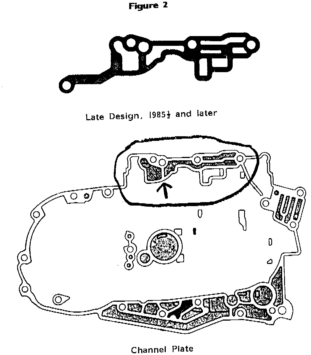 The arrows in Figures 1 and 2 point to a rib in the channel plate that changed location in mid-1985