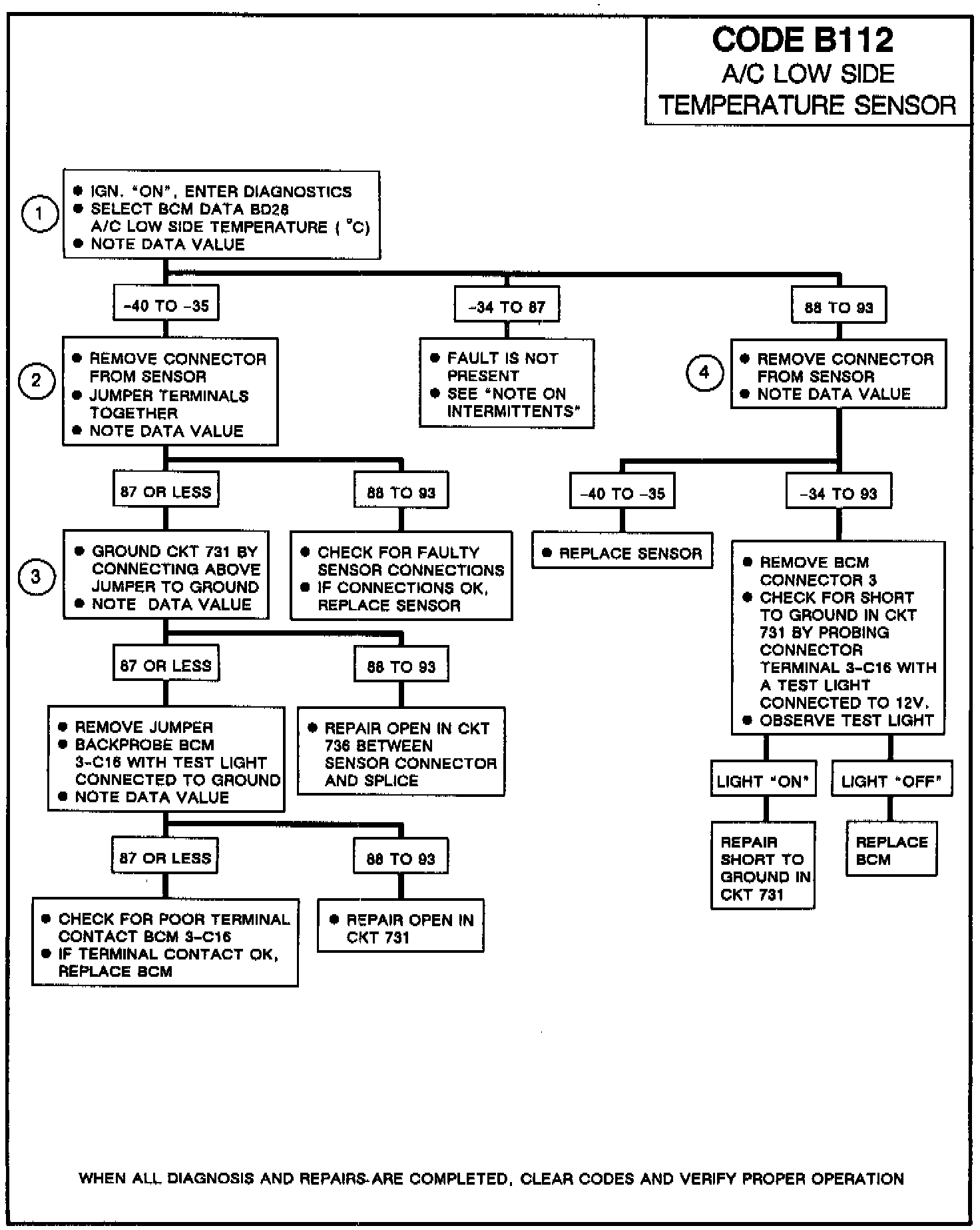 Code B112 will set if the ignition is on, the outside temperature sensor has not failed and reads above 0°C (32°F) and the signal voltage indicates less than -34°C open CKT) or over 87°C (shorted CKT). During the time the failure is present a substitute temperature reading (the same value as outside air temperature) will be implemented to allow continued operation of the climate control system, also the compressor clutch will be disabled. The A/C low side temperature reading BD28 will, however, display the actual sensor reading.