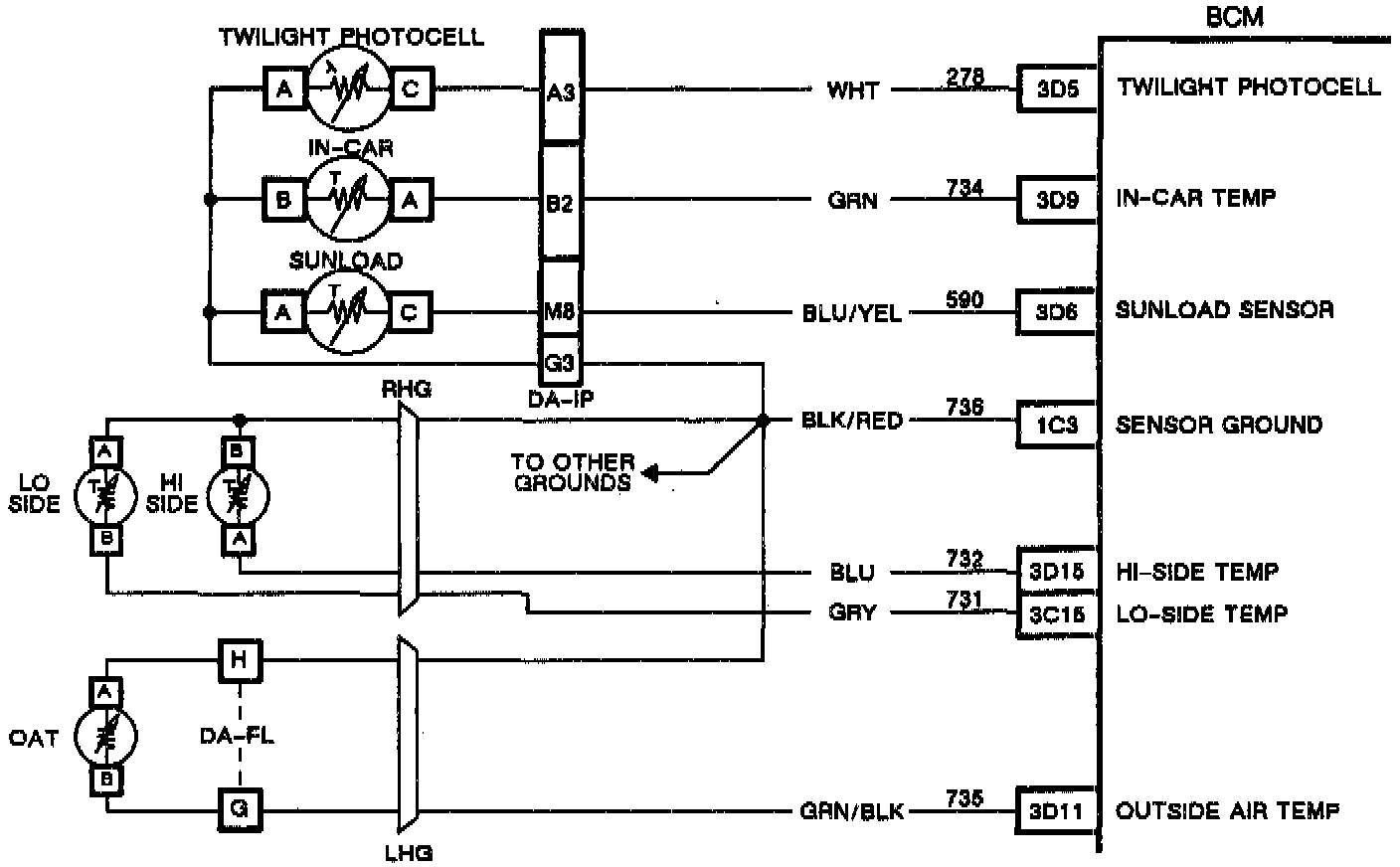 The A/C low side temperature sensor is a thermistor that controls the signal voltage to the BCM. The BCM applies a voltage on CKT 731 to the sensor. When the sensor is cold its resistance is high, therefore the BCM will see a high signal voltage. As the sensor warms, its resistance becomes less and the signal voltage is pulled low through the sensor ground, CkT 736. This signal voltage will vary between 5V (open CKT) and 0V (shorted CKT).