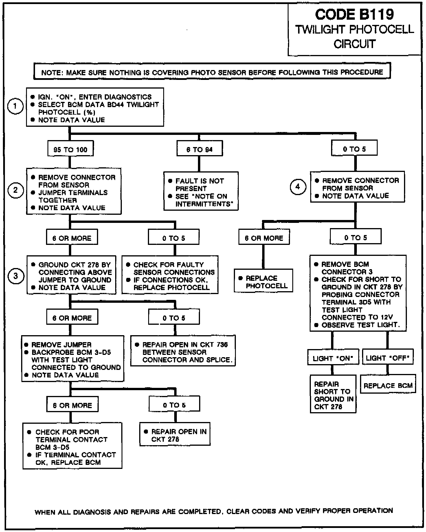 Code B119 will set if the ignition is on and the signal voltage indicates more than 94% (open CKT) or less than 6% (shorted CKT). During the time the failure is present a substitute light reading (indicating darkness) will be implemented to allow continued operation of the headlamps. The measure of light reading BD44 will however. display the actual sensor reading.