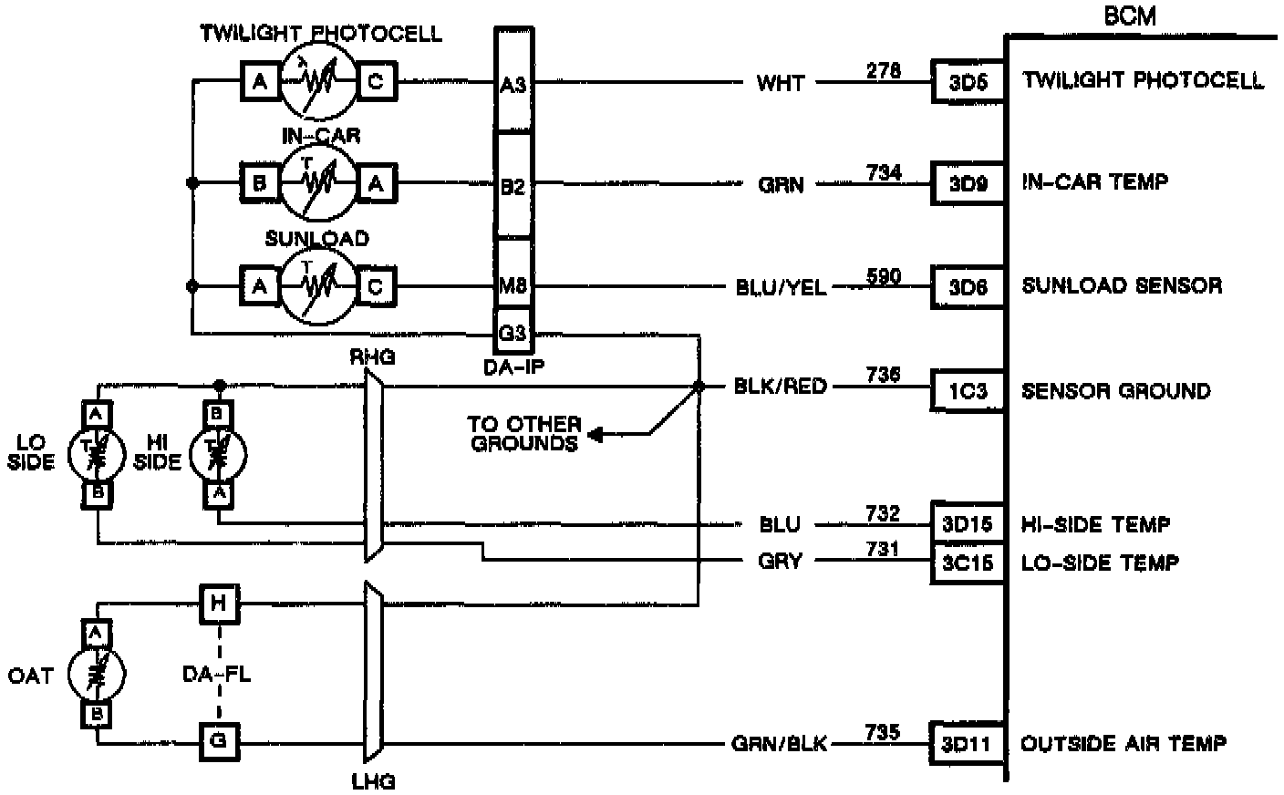 The twilight sensor uses a photocell to control the signal voltage to the BCM. The BCM applies a voltage on CKT 278 to the sensor. When the sensor detects darkness its resistance is high. therefore the BCM will see a high signal voltage. As the sensor detects light its resistance becomes less and the signal voltage is pulled low through the ground. circuit 736. This signal voltage will vary between 5V (open CKT) and 0V (shorted CKT).