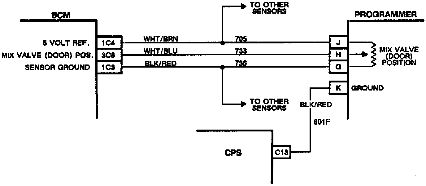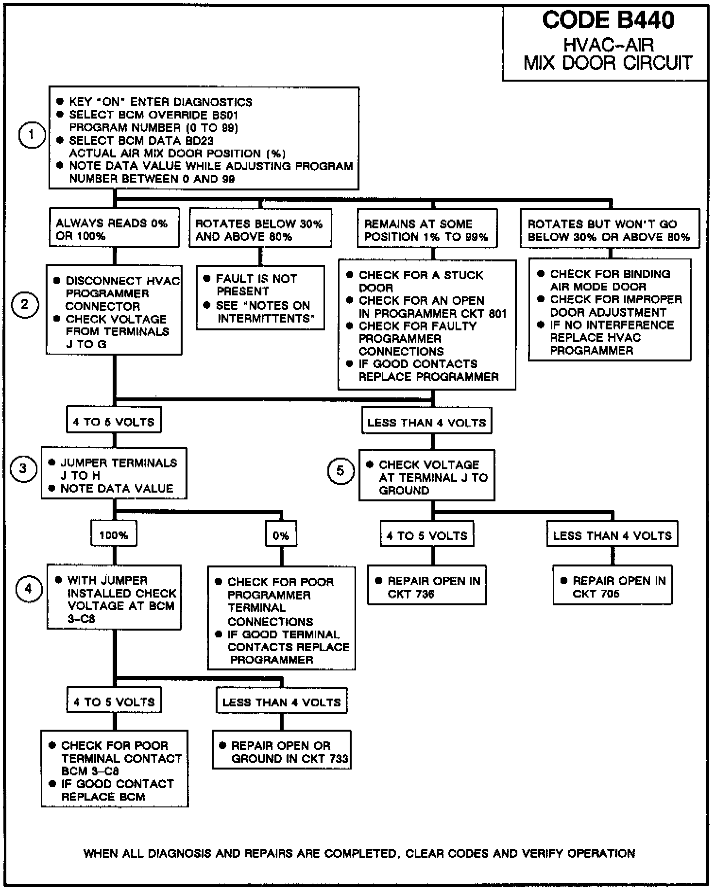 Code B440 is set by the BCM if it is unable to move the air mix valve (door). The BCM requests the valve (door) to move over the data CKT 800 to the programmer. With the ignition on, the programmer supplies 5V from BCM CKT 705, to a motor which drives the air mix valve (door). The BCM monitors a feedback pot on the dc motor which varies between 0 and 5 volts depending on its position. If the valve (door) is requested to move but the feedback voltage does not change, BCM stores code B440 to indicate that the valve (door) is not responding to its command. If the air mix valve (door) feedback indicates it is near the hot or cold extreme, the code will not set if it is commanded to move to that extreme.