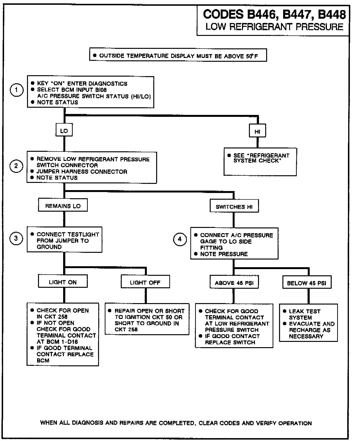 The BCM determines the state of charge by its low side temperature sensor and the low refrigerant pressure switch. Since temperature and pressure are proportionally related in the A/C system, a low temperature is the same as low pressure. In addition to the message, the BCM will store in memory a diagnostic Code B446, B447 or B448 to indicate that a low refrigerant condition was detected.