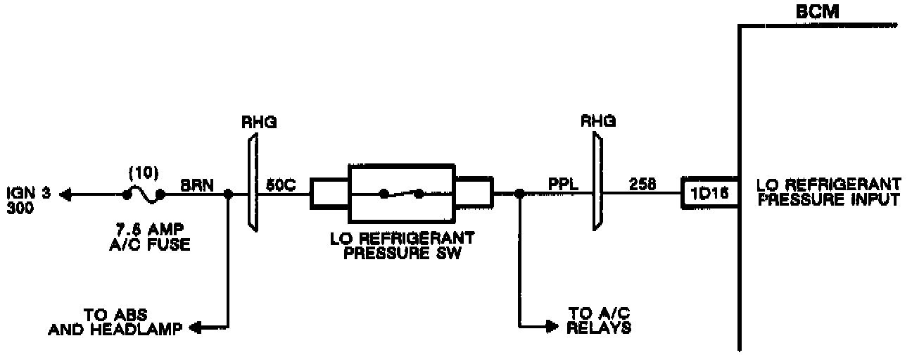 In the process of controlling the compressor clutch, the BCM monitors certain system inputs for an indication of low refrigerant charge. If the system refrigerant state of charge should fall below approximately one third its capacity, the BCM is capable of detecting this condition and will display a driver warning message to warn the operator. Refer to Climate Control Diagnostics for details on the control of this message. Heating and Air Conditioning