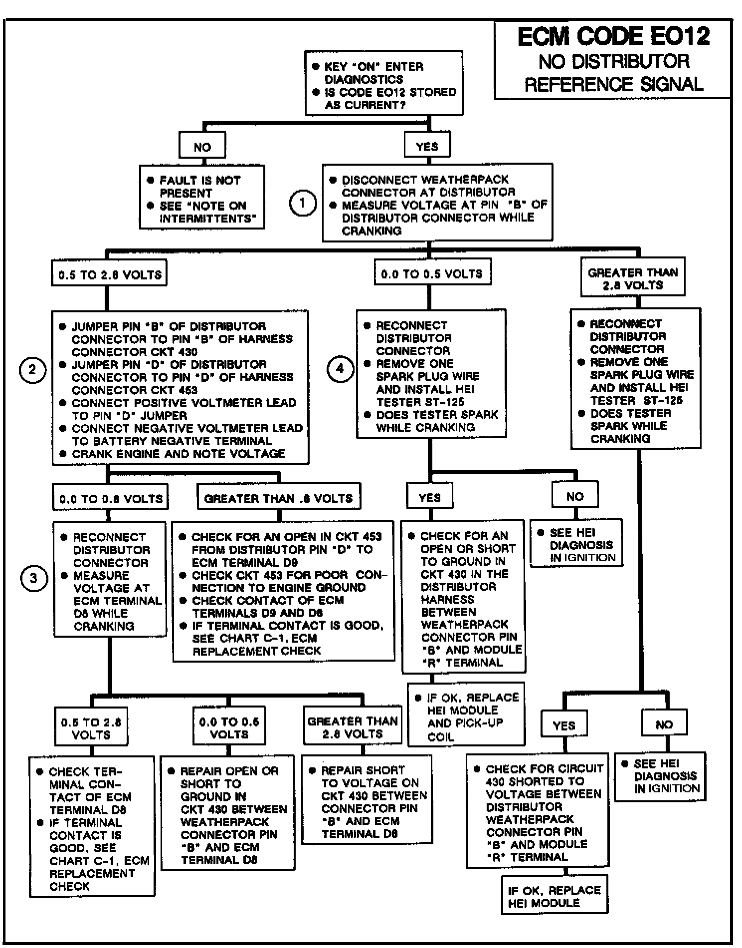 If Code EO12 is stored as a history code, start the engine and allow to idle while manipulating CKT 430 and 453. An intermittent open will cause the engine to stumble or quit when the ECM loses distributor reference signals. If the wiring and ECM connectors are OK, check the HEI pick-up coil leads for an intermittent open circuit. See HEI Diagnosis.