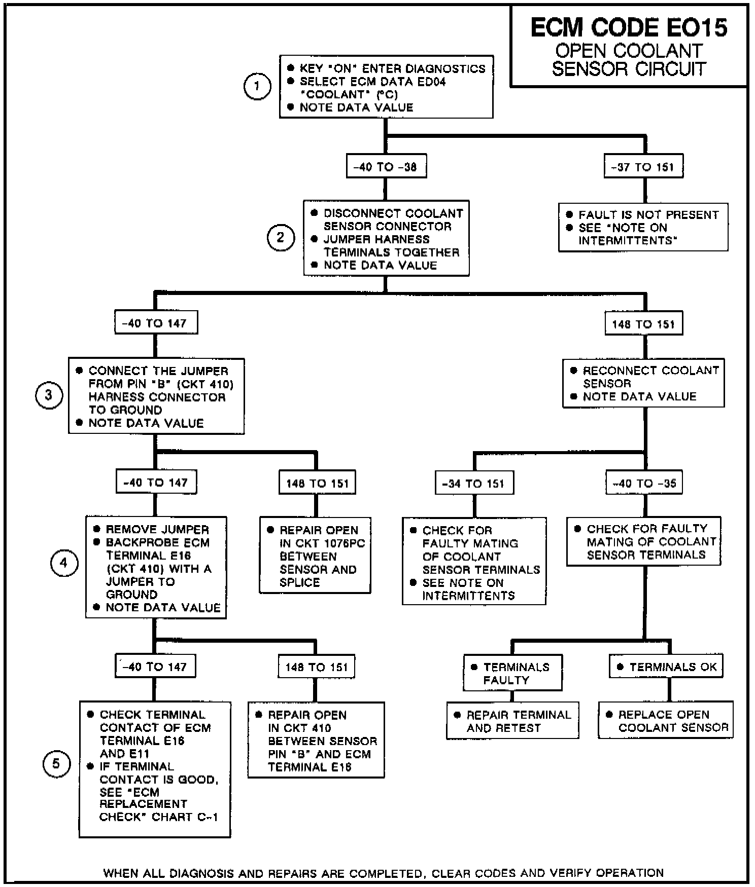 2. Checking for an open in CKT 410 from ECM to sensor. If ED04 shows 148-151°C with the coolant sensor wiring harness terminals jumpered together, then CKT 410 and 1076 are OK.