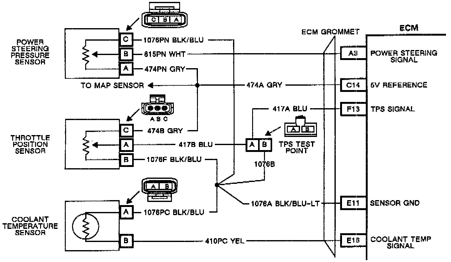 The coolant sensor is a thermistor, a sensor whose resistance varies with temperature. The coolant sensor is a "two wire" sensor with sensor signal on CKT 410 (pin B) to the ECM and sensor ground on CKT 476 (Pin A) to the ECM. As the temperature of the sensor increases, resistance decreases. As resistance decreases, the ECM sees less voltage drop across the sensor and interprets it as high coolant temperature. High coolant temperature will result in low signal voltage on CKT 410 and low coolant temperature results in high signal voltage on CKT 410. Code EO15 "Open Coolant Sensor" sets because the coolant temperature cannot be less than -38°C when MAT is greater than -5°C.