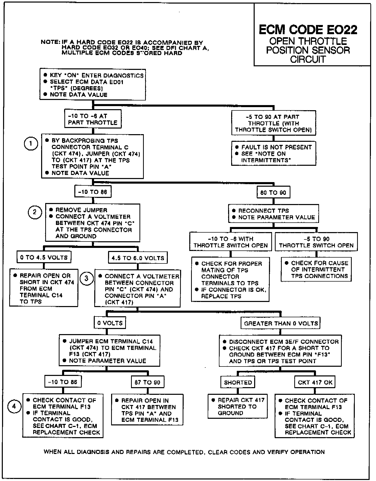 If a Code EO22 is intermittent, manipulate TPS connector, TPS wiring, and ECM connector while observing ECM Data ED01. If the fault is induced, the data value will momentarily jump from a normal reading to -6 degrees or less. Check the TPS test point for a short to ground. Cycle the TPS through its travel and tap on the TPS with a pencil or pocket screwdriver while observing ECM Data ED01 to test for an intermittent TPS. If wiring and connectors check out OK, substitute a known good TPS and retest.