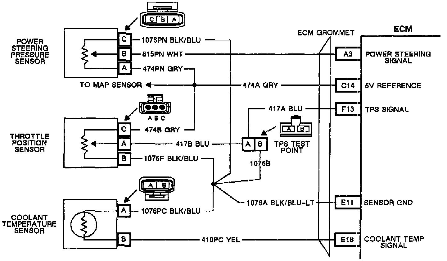 The Throttle Position Sensor (TPS) is a "3-wire" sensor or potentiometer. A 5 volt reference is provided at Pin C on CKT 474 and ground is provided at Pin B on CKT 1076. The TPS signal circuit (Pin A CKT 417) varies between ground and 5 volts based on the position of the throttle plates. At low throttle angle, the TPS signal voltage is low (about 0.5 volts at minimum air setting) and at high throttle angles, and TPS signal voltage is high (about 4.5 volts at WOT). The ECM uses TPS information to determine fueling needs (WOT enrichment, acceleration enrichment).