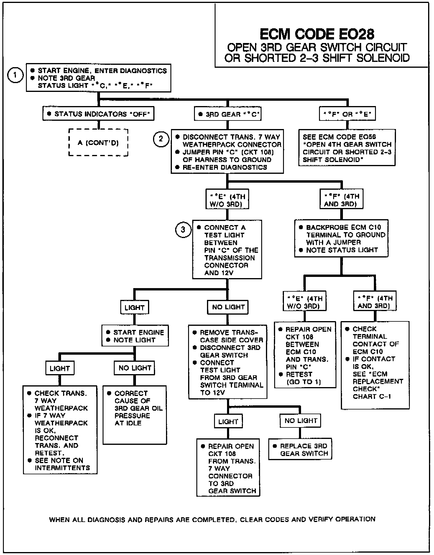 At key "ON", engine "OFF", manipulate transmission connector, transmission wiring, and ECM connector while observing the third gear status light (°C). if the third gear status indicator flashes on, repair intermittent open in CKT 108 (third gear).